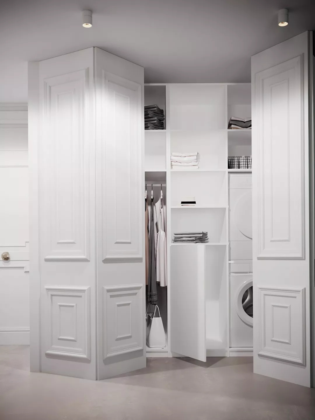無法設置獨立的衣帽間,這個時候可以利用轉角這個被大家認為空間死角的位置,利用兩處相連的墻面,用衣柜拼接設計,讓轉角區域成為一個衣帽間,不僅節省了空間,也很美觀。