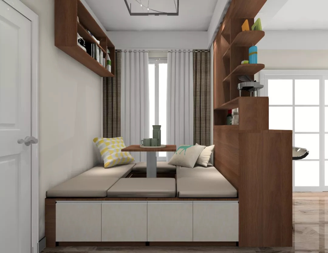 榻榻米之下的空間可以作為儲物空間。設計時要注意面板的承重能力,結實耐用的實木面板作為面是很好的。如果家里有安裝地暖,那么榻榻米之下的空間就不宜作為儲物空間了,對儲物空間的物品加熱,也許會損壞物品。