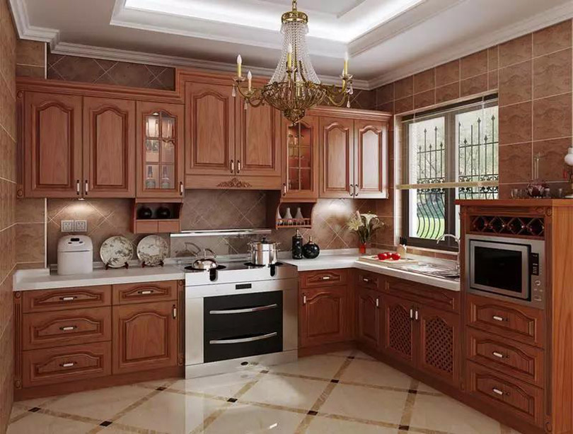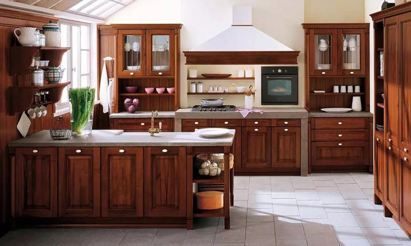 使用實(shí)木制作櫥柜門板,風(fēng)格多為古典型,美式、中式家居風(fēng)格中比較常見(jiàn),以櫻桃木色、胡桃木色、橡木色為主。