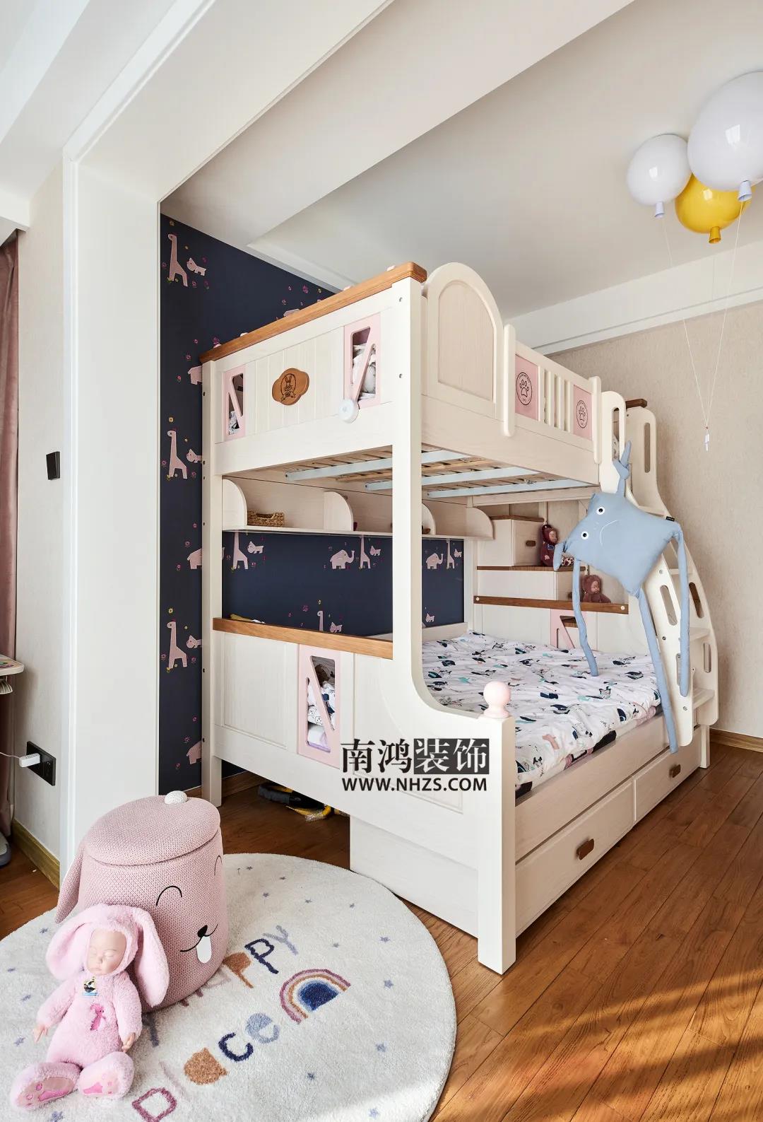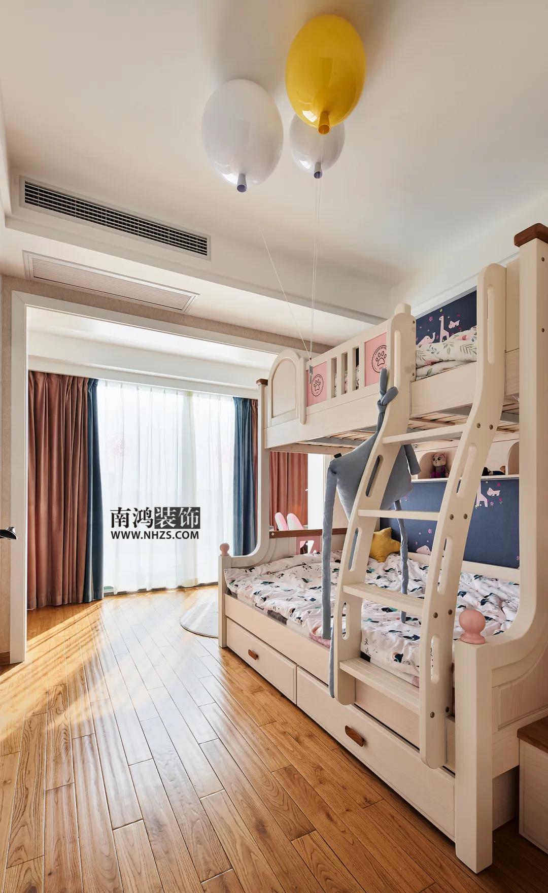 兒童房,選用柔和色系搭配各種玩偶元素來裝扮這個童心空間,用上下鋪實現居住功能,樓梯則作為隱蔽的抽屜解決一些儲物問題。