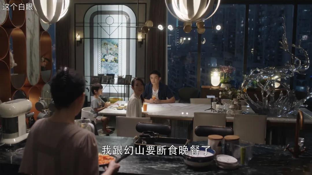 餐廳最夸張的設計是超長的大理石餐桌,一半用作就餐,一半做了一個淺水槽,槽內布了一個超大的琉璃雕塑風水局,因為水利萬物,顧家是做煙花生意的,喬遷的時候不能過火盆,這個風水局能讓生意風生水起。