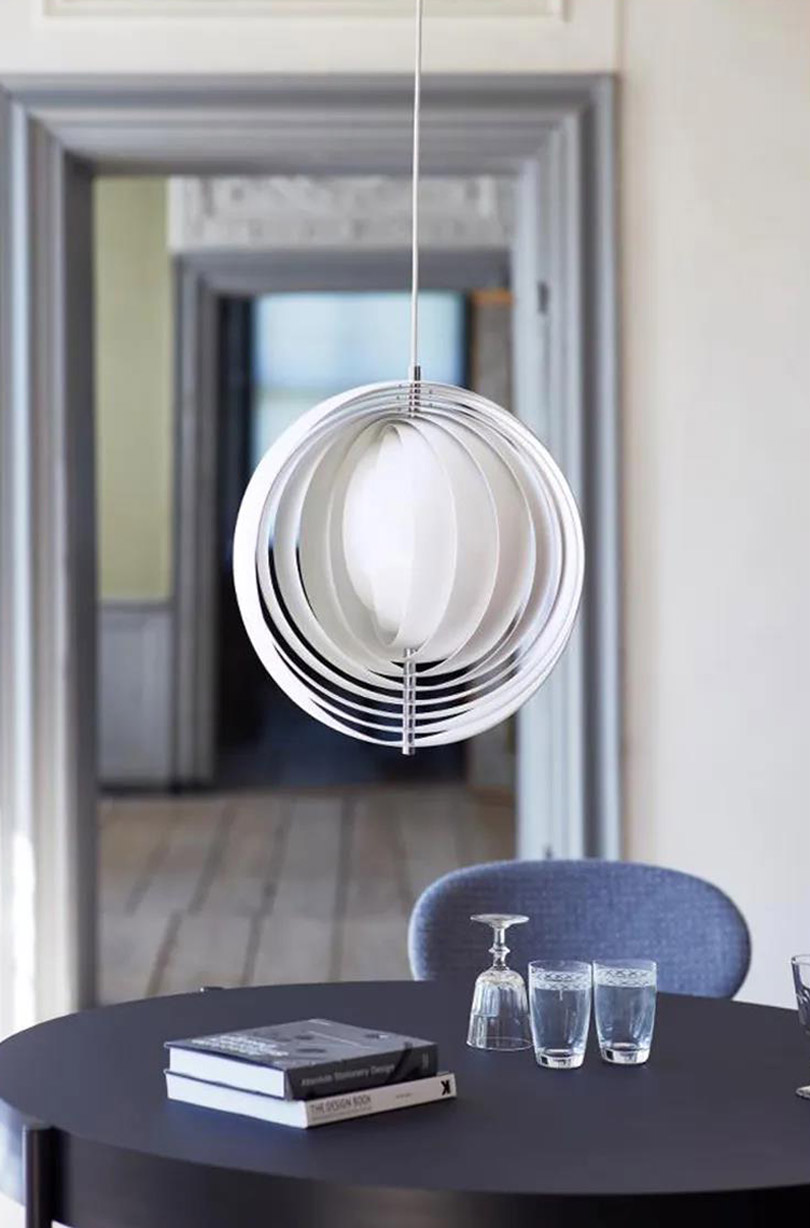 吊燈是Verpan Moon,金屬材質的弧形板條像扇子一樣排列組合,這盞燈曾在《神探夏洛克》里出現過。