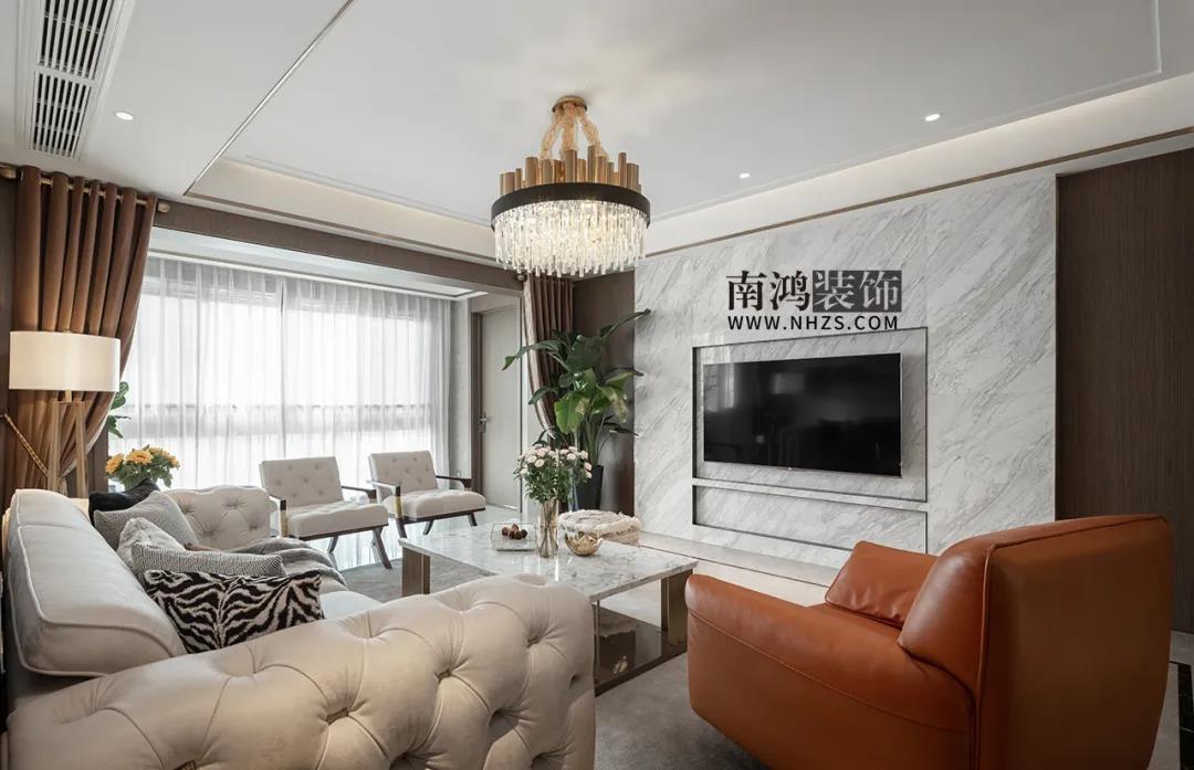 家具用料完美兼容了質(zhì)樸與奢華的氣質(zhì),大理石臺面的茶幾與頂上繁復(fù)的吊燈呼應(yīng),搭配金屬質(zhì)感與清新綠植的點綴,營造出優(yōu)雅端莊的會客環(huán)境。