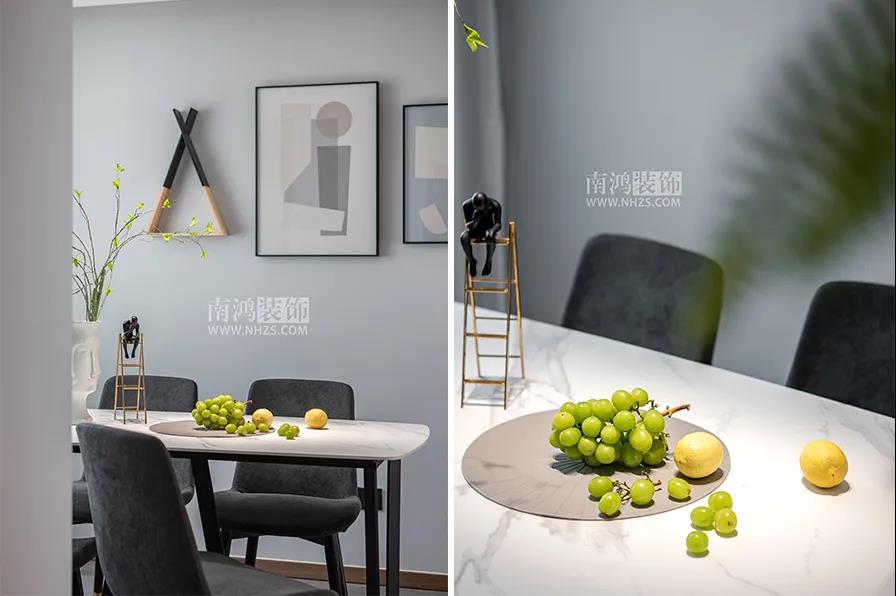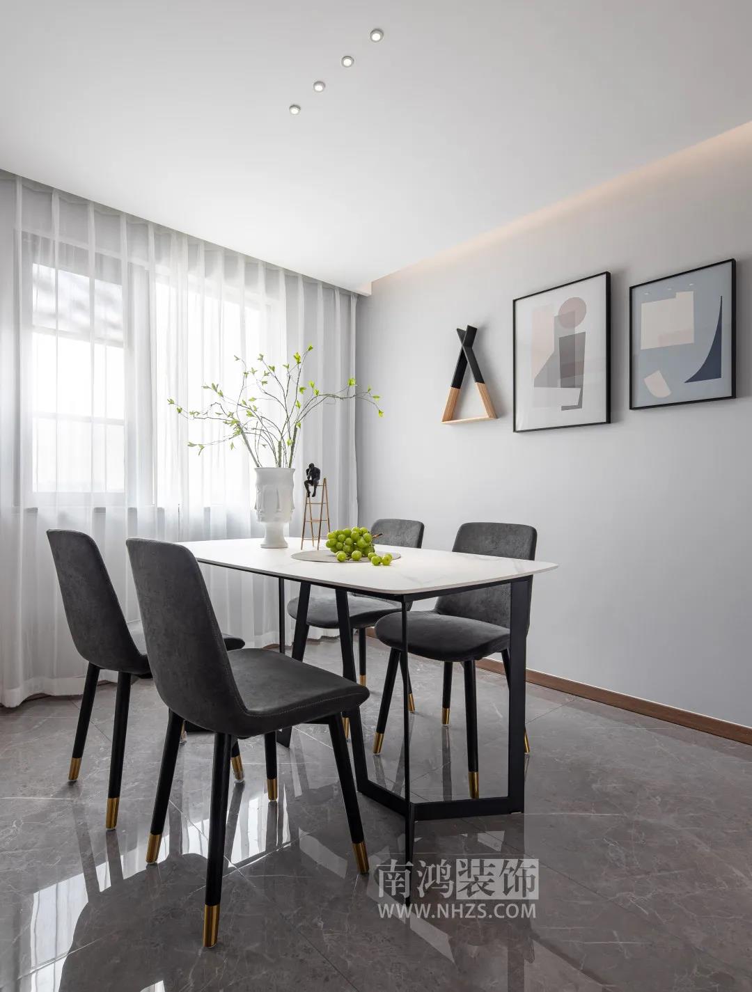 餐廳,纖薄的石材桌面搭配簡約風的灰色餐椅,桌椅低調至簡,再配上白紗簾,頗有清風徐來的唯美之意。