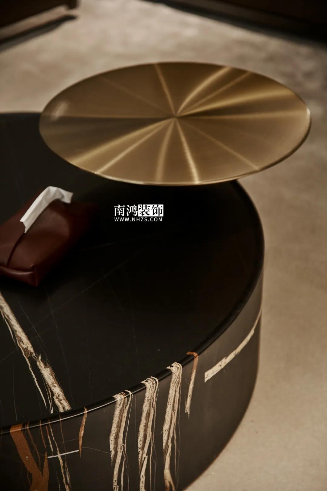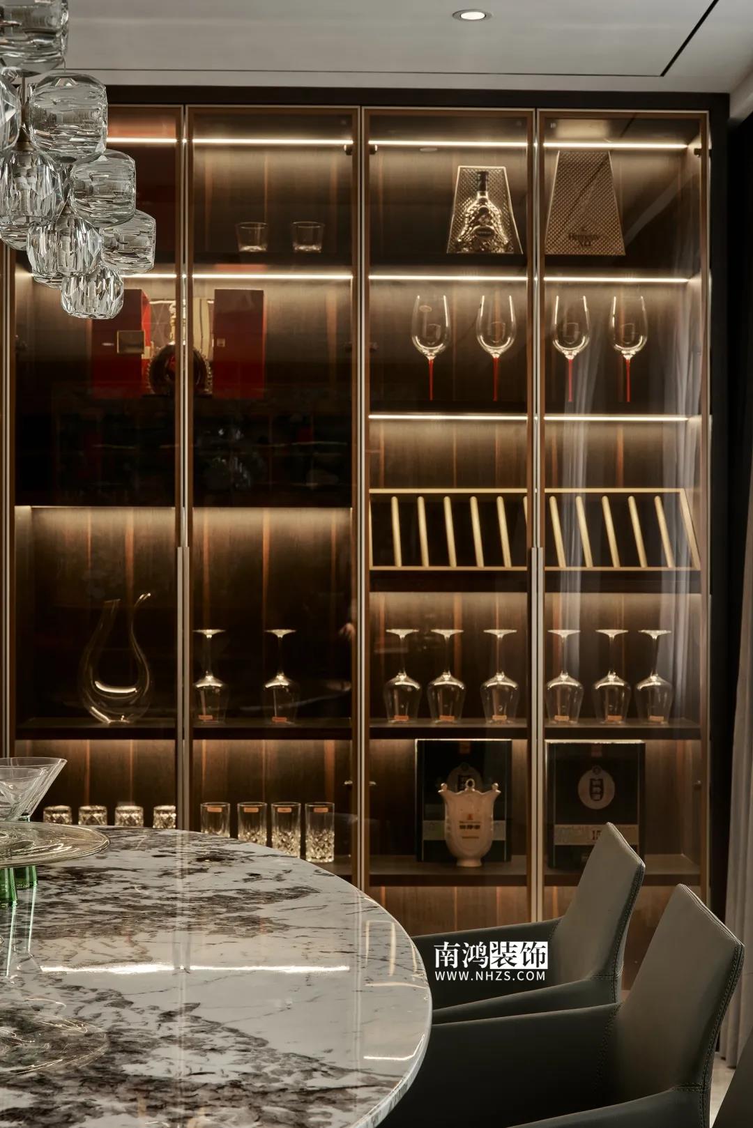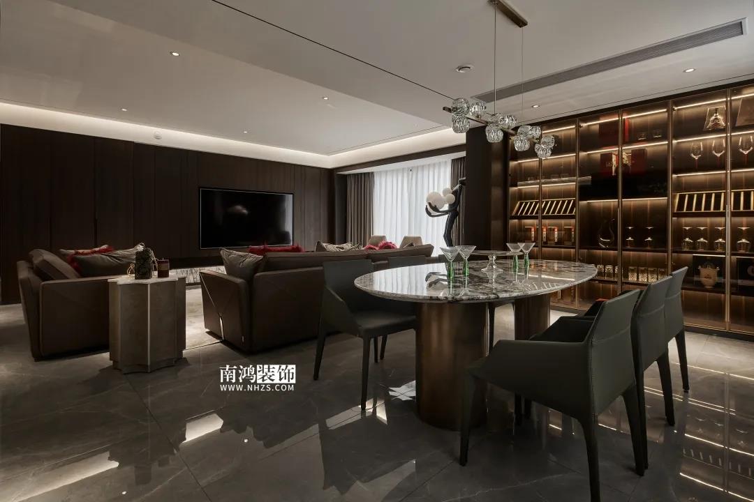 屋主偏愛深色系,因此設計師精細地調配深色在空間中的比例,運用護墻板、大理石、皮革等質感材質,借助燈光效果,為他們打造了這個頗具神秘感和高級感的暗色空間。