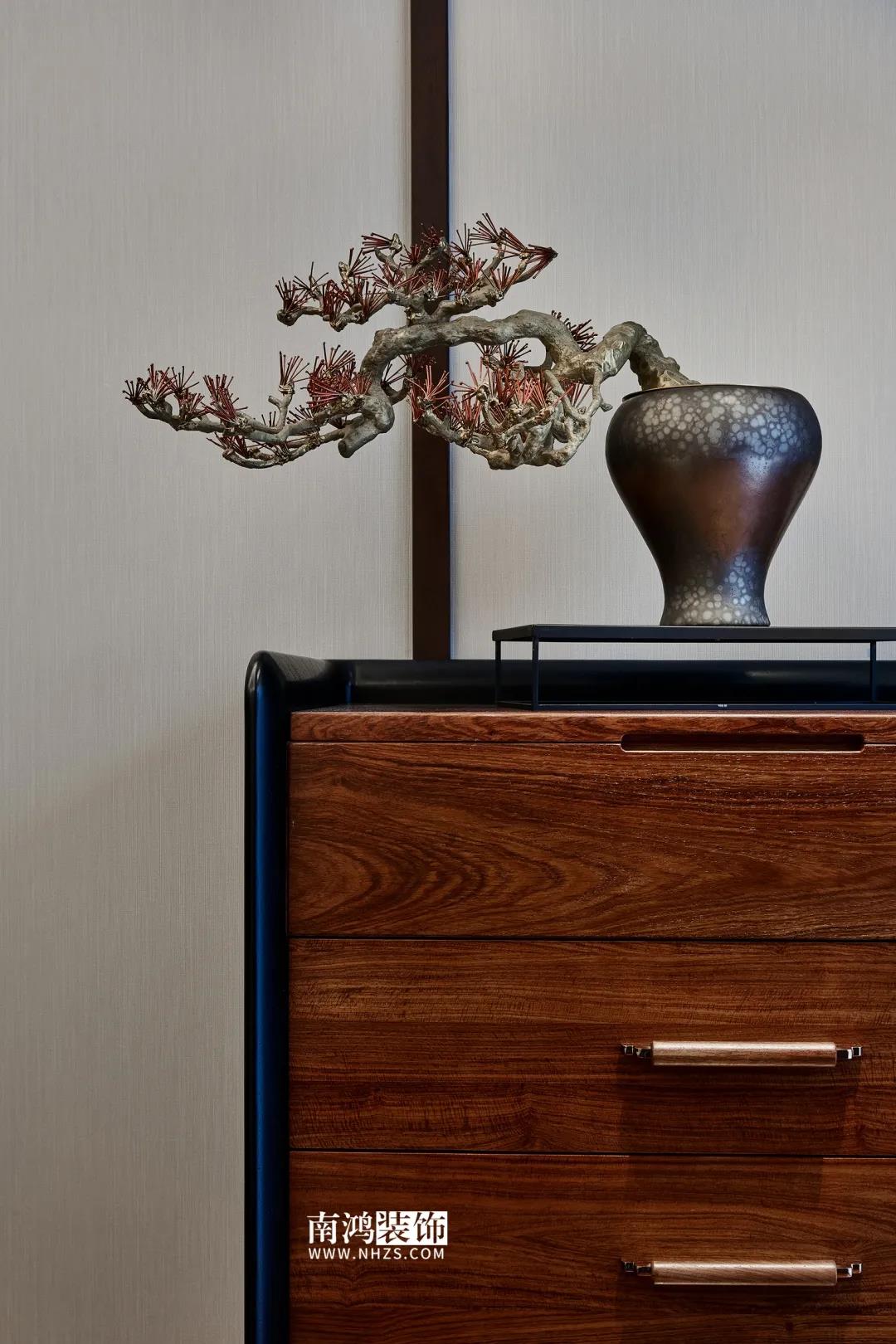 三口之家,兩代人的生活雅居。簡潔利落的空間中,沒有過于繁雜的造型,直線感的設計給予中式藝術更多表達的余地,孕育出與眾不同的素雅,讓人在亦張亦弛中品鑒到東方美學的底蘊。