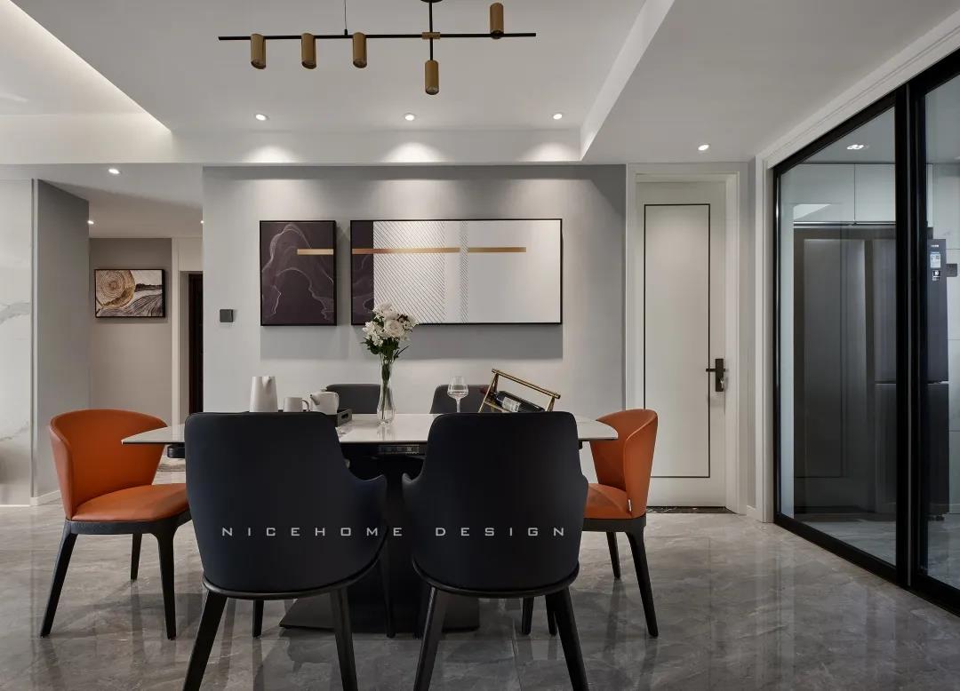 地址 / 楊公佳苑 戶型 / 三室兩廳 面積 / 110㎡ 風格 / 現代簡約 設計施工 / 浙江南鴻裝飾 裝飾亮點 ? 本案整體設計以沉穩時尚的黑白灰質感為出發點,擯棄一切復雜的外在形式,回歸到生活的本質。 戶型圖 ? 01. 客廳 LIVING ROOM 黑白灰為主色打造的簡約居家環境,通過窗簾、掛畫與單人沙發等軟裝元素進行色彩點綴,看似簡單隨意,層次性卻一點不差。 家具雖陳設簡單,在材質與顏色上都做到了巧妙呼應。 沙發旁打造一組黑色柜體,增加儲物設計??臻g內的黑白灰色塊得到有機統一,顯出高級質感。 02. 餐廳 DINING ROOM 餐廳恰好處于過道口,好比一個交通樞紐,將家中多個空間聯結在一起,相鄰的距離也讓客廳的簡約氛圍得到了延展。 現代風六人位家庭餐桌,干凈的桌面顏色,搭配柔和的餐椅線條,看起來十分時尚。過道口兩側嵌入黑白色柜體,作為實用而美觀的一面背景。 簡約又帶有藝術感的掛畫,是整體氛圍的萃取凝結。 △餐廳望向過道的視角 03. 廚房 KITCHEN 廚房櫥柜以上淺下深的配色,營造視覺層次感,無把手設計更顯利落。 04. 臥室 BEDROOM 臥室以精簡的布置,搭建秩序理性的氛圍場域,黑白灰過渡而來的休憩空間顯得尤為沉靜。 背景墻采用拼接感紋理墻布裝飾,素雅別致,兩側是壁燈與吊燈的不對稱組合,以這種非對稱的形式成功打破空間序列感。 陽臺包進做書房使用,結合開放式書架,休閑、美觀與收納屬性兼備。 05. 陽臺 BALCONY 生活陽臺,定制洗衣柜將洗衣機納入,吊柜用來收納生活用品與雜物。 06. 衛生間 BATHROOM 衛生間鋪貼大理石紋理的瓷磚,白色讓視覺十分明朗干凈,又有著擴容的效果。