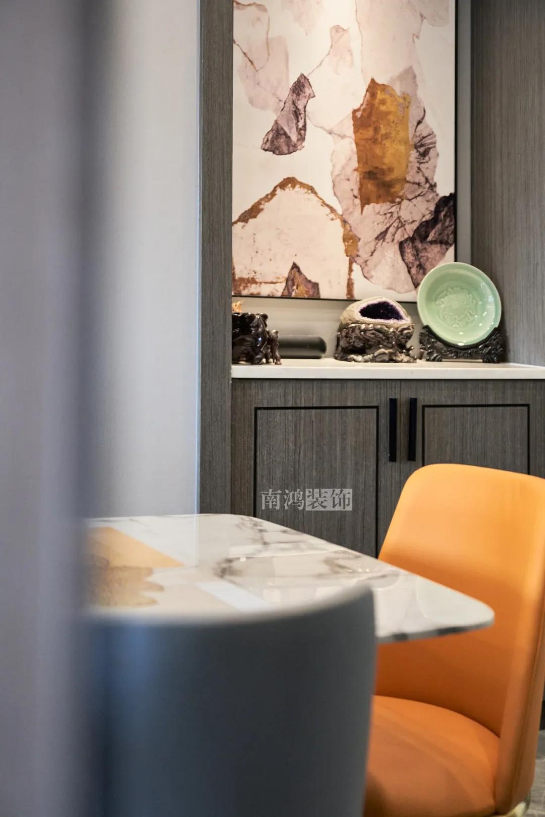 餐廳選用大理石面的餐桌搭配皮藝餐椅,金屬腳增添精致,頂面無主燈足夠簡潔大氣??看芭_一側打造了西廚吧臺,平??梢宰鲎龊啿?,用來吃早飯或品酒品茶都是很方便的。