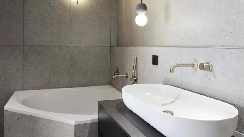 因為嵌入式浴缸不易更換,建議選擇使用壽命長的鑄鐵浴缸。嵌入式浴缸的臺面一般采用磚砌結構,表面可以選擇瓷磚、大理石或者防潮木等。