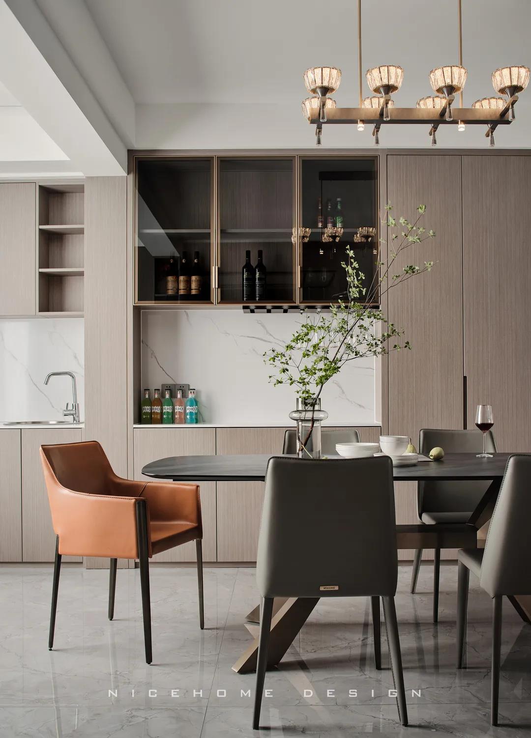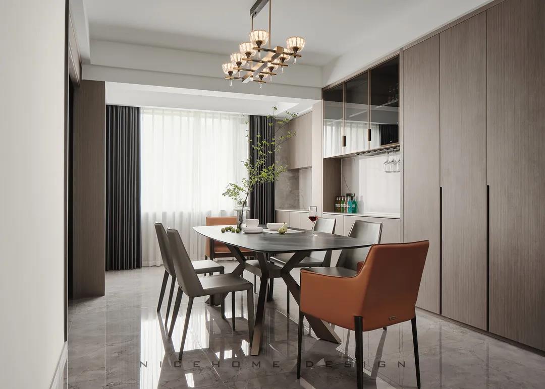 【項目·信息】 地址 / 銀億東岸 戶型 / 四室兩廳 面積 / 200㎡ 風格 / 現(xiàn)代簡約 設計施工 / 浙江南鴻裝飾 1 關(guān)于作品 本案以現(xiàn)代簡約為主題,簡潔明快的設計風格為主調(diào),著力體現(xiàn)家的精致與個性,符合現(xiàn)代人的生活品味。 公共區(qū)域整體采用暖咖和黑、白色調(diào),溫和親切又帶著現(xiàn)代感的利落灑脫,木格柵增強視覺效果,軟裝上則重點用橙色點綴,烘托溫馨氣氛與活力感受。 2 戶型圖 3 設計落地 玄關(guān) ENTRANCE 玄關(guān)端景處一幅格外醒目的復刻畫,大色塊的紅彰顯熱烈、前衛(wèi),寓意主人對新生活的愛和熱忱,從今往后,要把每一天都過得“熱氣騰騰”! 客廳 LIVING ROOM 客廳,暖咖色伴隨著溫柔的觀感,讓時光也仿佛靜止于此。沒有特別多收納設計,這里的一切布置均以“美”為第一要義。 電視背景墻的設計,低調(diào)中透著華麗。高顏值的大理石磚搭配錯落有致的木格柵,冷暖結(jié)合,細節(jié)處再點綴光影,簡潔而富有格調(diào)。 木質(zhì)格柵,素來自帶一種東方禪意之美,虛實相生,正是架構(gòu)意境的獨到方式。木飾面板中藏起通往次臥的房門,視覺高度統(tǒng)一。沙發(fā)與茶幾選擇低矮款式,有利于縱向拉伸層高。 餐廳 DINING ROOM 一個優(yōu)秀的餐廳,光靠視覺,就能成功挑動你的味蕾,再平凡的食物也因此裹上了一層美好滋味。 整排餐邊柜兼做酒柜,玻璃柜內(nèi)藏酒,儲物柜里存放食品,實用性與美觀度都是一流。窗邊做了小水吧,延續(xù)廚房的功能,餐前餐后的手部清潔也更方便。 在這里每天給孩子做一頓愛心早餐,給愛人煮一壺香醇的咖啡,幸福的感覺就這樣漸漸氤氳開來。 廚房 KITCHEN 廚房寬敞明亮,黑色櫥柜較一般櫥柜而言更能凸顯質(zhì)感,功能設備完善,在吊頂上也做足了功夫,造型感與線條感呼應整體風格。 過道 CORRIDOR 溫潤的木材非常容易給人親近的感覺,無形中就消弭掉空間與居者的距離。過道一側(cè)設計儲物區(qū)域,層架上適合擺放書籍、小飾品等,空間瞬時生動了起來。 臥室 BEDROOM 主臥延續(xù)公共區(qū)域的色調(diào),米灰色硬包和木飾面,讓溫暖、淡雅的味道徘徊其中。一盞暖意小吊燈垂下,增強空間的調(diào)性,小飄窗則賦予臥室更多的浪漫色彩,和對生活的美好想象。 次臥,皮藝、布料、金屬與線條的融合,交匯出高品質(zhì)精致感。 粉色是兒童房一直在流行的主題,許多女孩子的夢里或許都有這樣一個如童話般的飄著粉紅泡泡的房間吧~