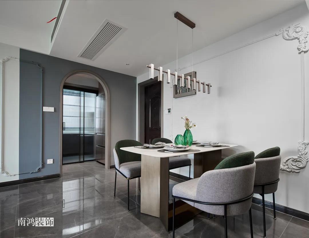 硬裝整體簡潔,墻面可見石膏線花紋裝飾,借此強化一定法式空間意象。餐桌椅、吊燈的造型選擇也都偏現代,空間中奢與簡的分寸把握得恰到好處。