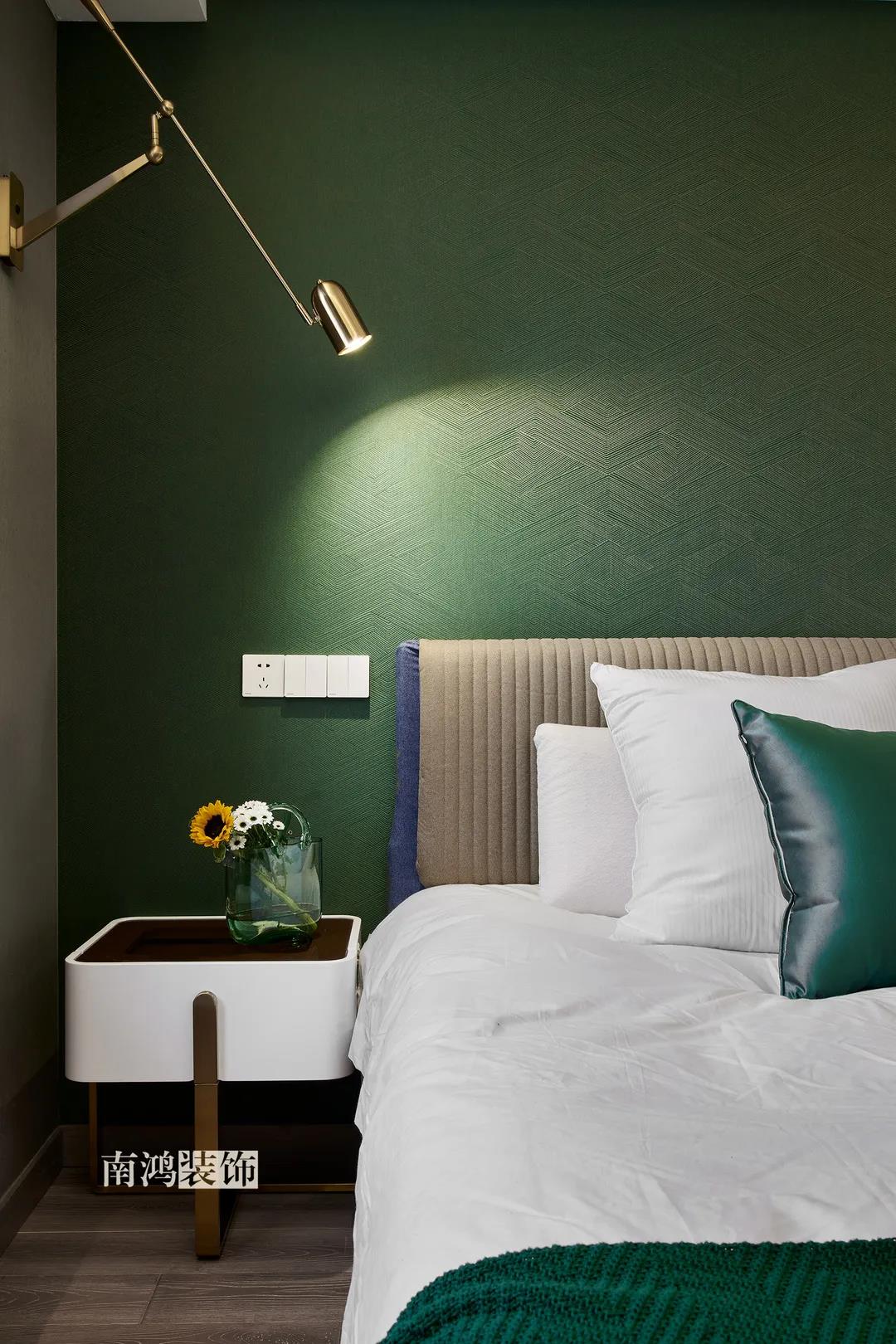 主臥,青草綠墻布做背景裝飾,留白保持簡約調性,一幅婚紗照訴說著夫妻二人簡簡單單、明明白白的甜蜜愛情故事。